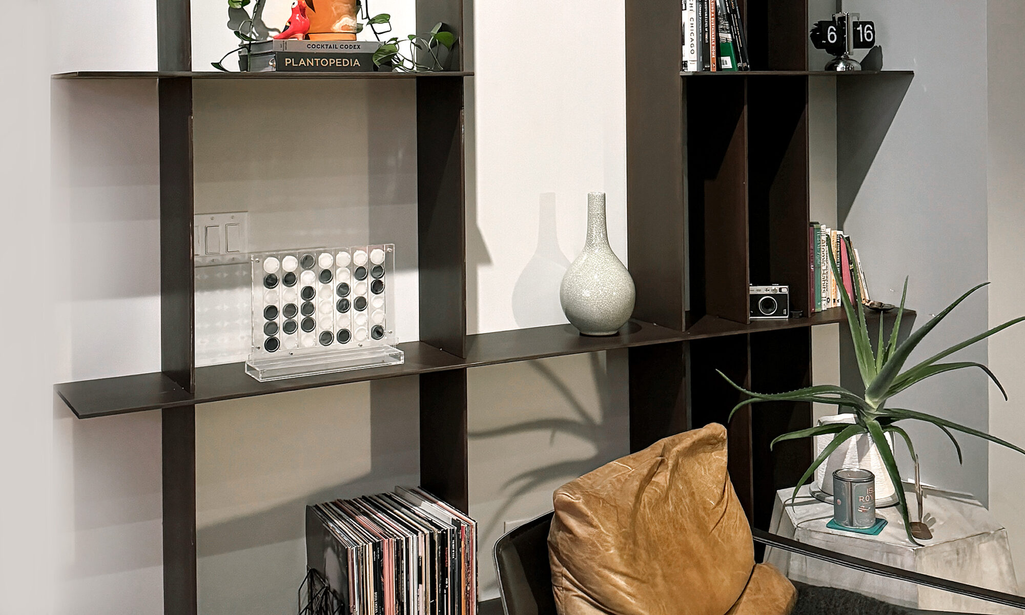 Weighing in at a hefty 1600lbs, this slab steel bookcase integrates into this Ravenswood loft perfectly. Extending into the ceiling slots, the color and texture of the steel compliment the wood floors and exposed brick walls.