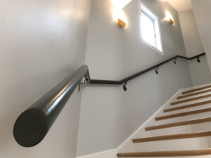 The unusual staircase layout and client preference for a single, continuous railing required a complete custom solution. Meticulous measurements of the staircase’s compound angles were taken. Seven pieces were created and then fully welded together onsite. Handrail brackets provided by the homeowner secured it in place.